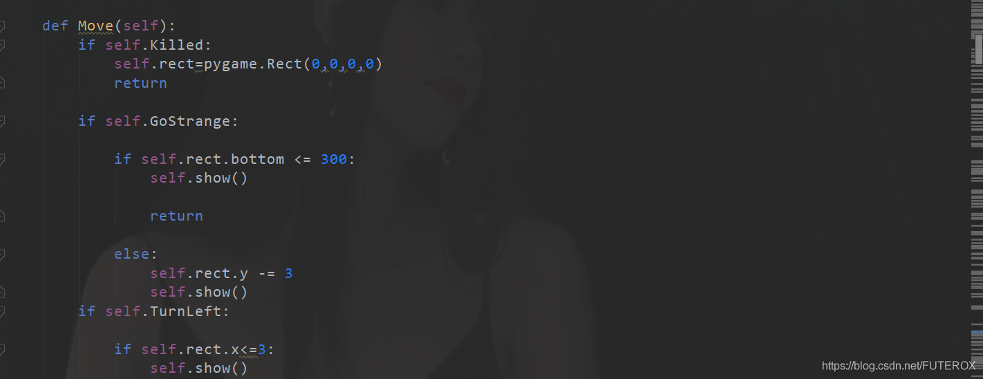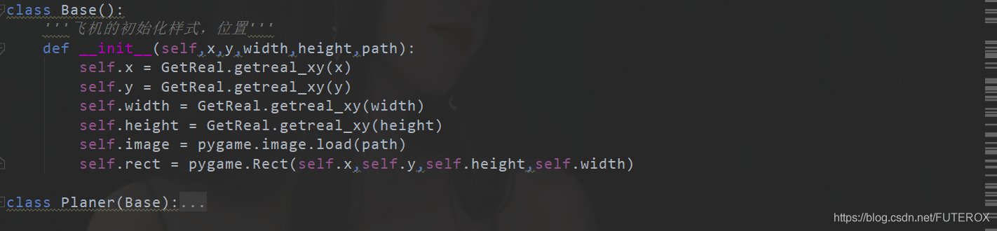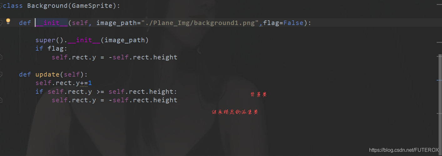 屏幕繪制直接使用pygame.display.set_mode()的bitl()繪制方法,進(jìn)行繪制。當(dāng)然這里的背景是會(huì)動(dòng)的。所以使用到了一個(gè)精靈的派生類。