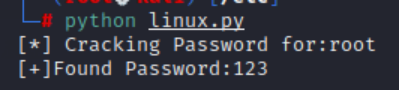 以上就是python滲透測(cè)試linux密碼激活的示例的詳細(xì)內(nèi)容,更多關(guān)于python滲透測(cè)試linux密碼破解的資料請(qǐng)關(guān)注腳本之家其它相關(guān)文章!