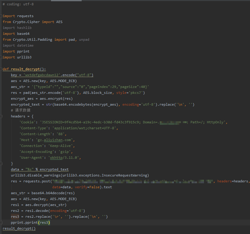 總結(jié)一下請(qǐng)求和響應(yīng)過(guò)程,就是請(qǐng)求體中的 data 經(jīng)過(guò) encrypt 函數(shù)加密傳參,改變 pageIndex 就可以得到每頁(yè)數(shù)據(jù),響應(yīng)是經(jīng)過(guò) decrypt 函數(shù)加密顯示,那我們只需要在 python 中實(shí)現(xiàn)這個(gè) aes 加密解密過(guò)程就行了,從反編譯的 java 代碼中可以看出密鑰是固定的:wxtdefgabcdawn12,沒(méi)有 iv 偏移。