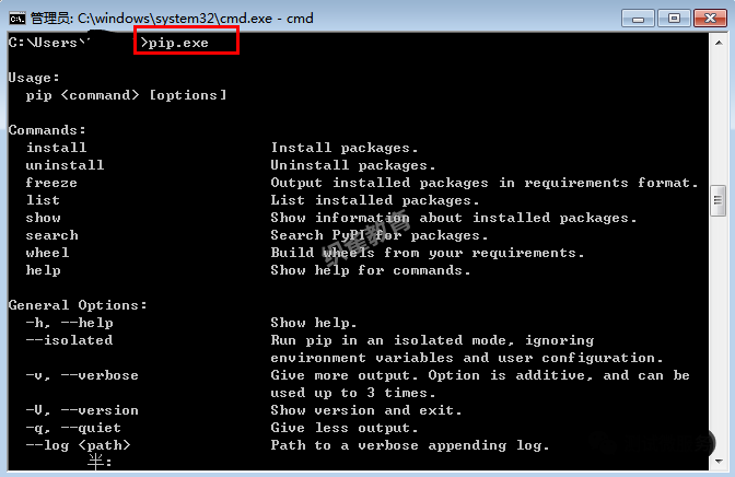 1.pip是一個.exe的可執(zhí)行文件,在cmd輸入pip.exe就可以解決了