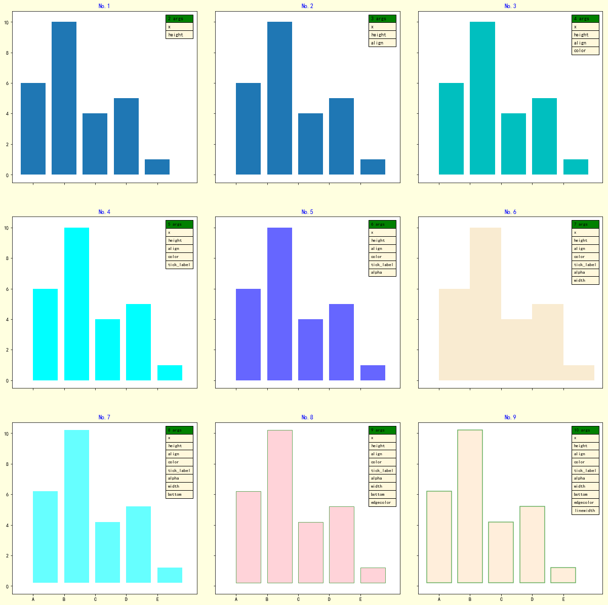 args = [[e] for e in ['x', 'height', 'align', 'color', 'tick_label', 'alpha', 'width',
