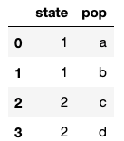 data={'state':[1,1,2,2,1,2,2,2],'pop':['a','b','c','d','b','c','d','d']}