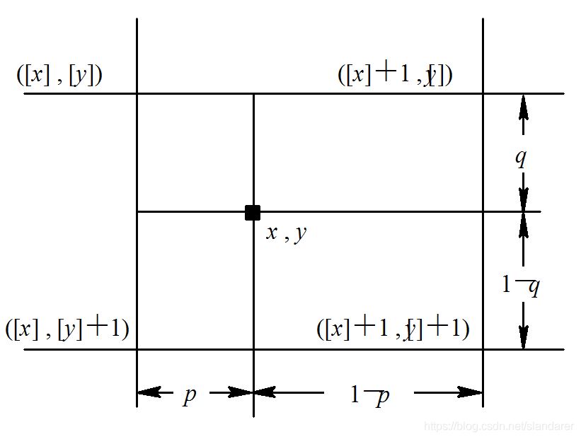 在參考代碼的基礎(chǔ)上,對映射像素進(jìn)行了插值處理,可以使圖像更加平滑,原理如下: