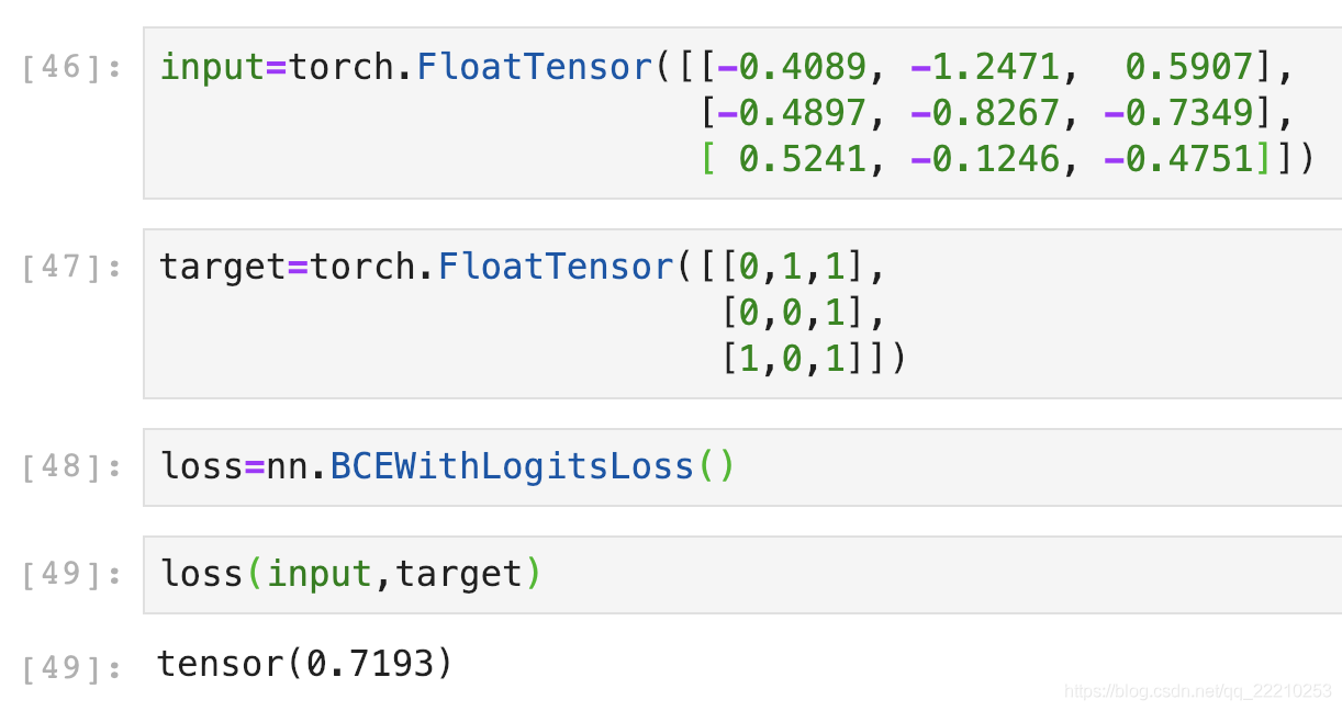 BCEWithLogitsLoss就是把Sigmoid-BCELoss合成一步。我們直接用剛剛的input驗證一下是不是0.7193: