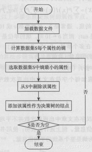 計算數(shù)據(jù)集S中的每個屬性的熵 H(xi)選取數(shù)據(jù)集S中熵值最?。ɑ蛘咝畔⒃鲆孀畲螅瑑烧叩葍r)的屬性在決策樹上生成該屬性節(jié)點使用剩余結點重復以上步驟生成決策樹的屬性節(jié)點