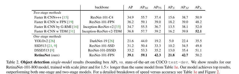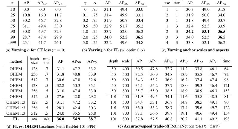 Table 1給出了RetinaNet和Focal Loss的一些實驗結(jié)果,從中我們看出增加α-類別均衡,AP提高了0.9,再增加了γ控制,AP達到了37.8.Focal Local相比于OHEM,AP提高了3.2。從Table 2可以看出,增加訓練時間并采用scale jitter,AP最終那達到39.1。