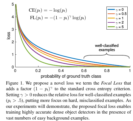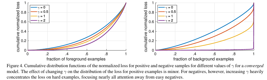 Focal Loss存在這兩個超參數(shù)(hyperparameter),不同的αt和γ,對于的loss如Figure 1所示。從Figure 4, 我們可以看到γ的變化對正(forground)樣本的累積誤差的影響并不大,但是對于負(background)樣本的累積誤差的影響還是很大的(γ=2時,將近99%的background樣本的損失都非常?。?。