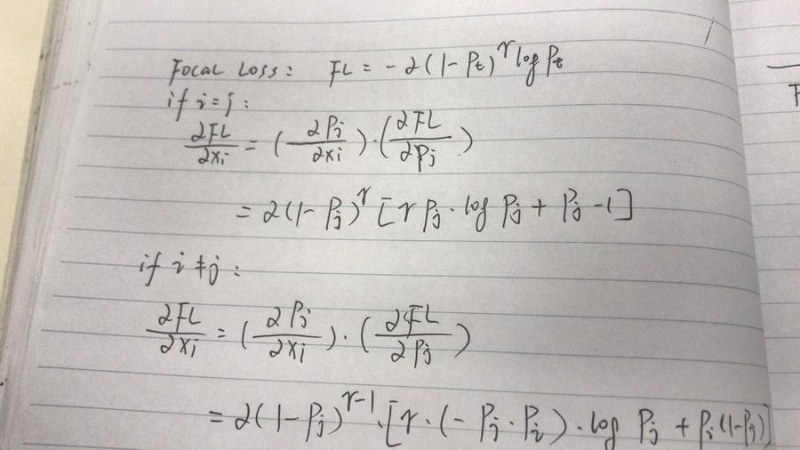 有了Softmax Activation的反向梯度傳播公式,根據(jù)鏈式法則,F(xiàn)ocal Loss的反向梯度傳播公式為