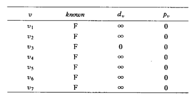 從s開(kāi)始到頂點(diǎn)的距離放到dv列里,pv列用來(lái)代表,當(dāng)前行代表的頂點(diǎn)的上一個(gè)經(jīng)過(guò)的頂點(diǎn)。known列代表此頂點(diǎn)已經(jīng)被處理過(guò)了。