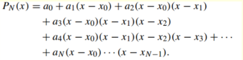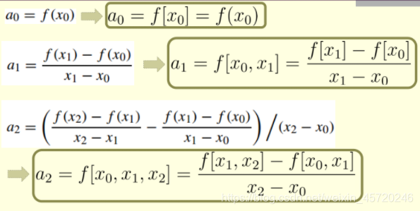 這里的的a0,a1…等可以通過逐一帶入點的值來求得。但是當項數多起來時,會發(fā)現式子變得很大,這個時候我們便要引入差商的概念(利用差分思想)具體見式子能更好理解