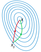 如圖所示,紅色是牛頓法參數(shù)更新的方向,綠色為梯度下降法參數(shù)更新方向,因?yàn)榕nD法考慮了二階導(dǎo)數(shù),因而可以找到更優(yōu)的參數(shù)更新方向,在每次更新的步幅相同的情況下,可以比梯度下降法節(jié)省很多的迭代次數(shù)。