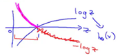 藍(lán)色的曲線表示的是對(duì)數(shù)函數(shù)的圖像,紅色的曲線表示的是負(fù)對(duì)數(shù) 的圖像,該圖像在0-1區(qū)間上有一個(gè)很好的性質(zhì),如圖粉紅色曲線部分。在0-1區(qū)間上當(dāng)z=1時(shí),函數(shù)值為0,而z=0時(shí),函數(shù)值為無(wú)窮大。這就可以和代價(jià)函數(shù)聯(lián)系起來(lái),在預(yù)測(cè)分類中當(dāng)算法預(yù)測(cè)正確其代價(jià)函數(shù)應(yīng)該為0;當(dāng)預(yù)測(cè)錯(cuò)誤,我們就應(yīng)該用一個(gè)很大代價(jià)(無(wú)窮大)來(lái)懲罰我們的學(xué)習(xí)算法,使其不要輕易預(yù)測(cè)錯(cuò)誤。