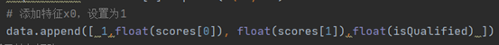 需要注意的是,我們的theta是三元組,θ0對(duì)應(yīng)的X特征值固定為1,因此讀取數(shù)據(jù)時(shí),如上圖最左側(cè)加入一個(gè)1;