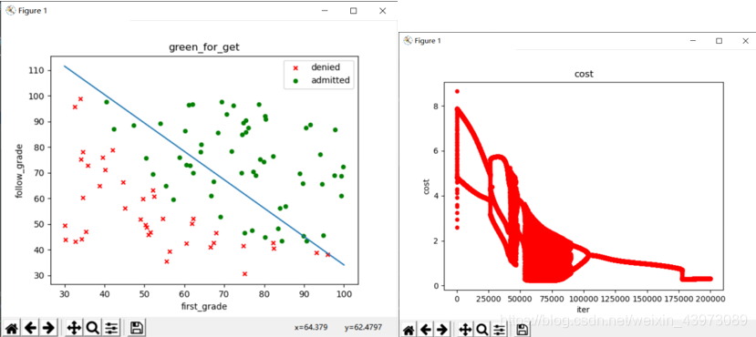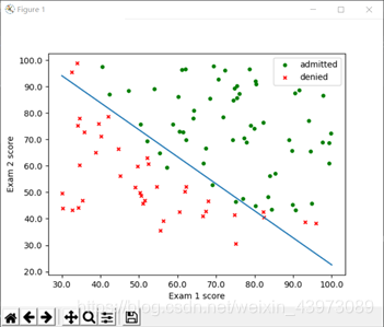 可以看到,被錄取與不被錄取的數(shù)據(jù)有較為清晰的一個(gè)界限,接下來(lái)我們要求解的就是這條界線;