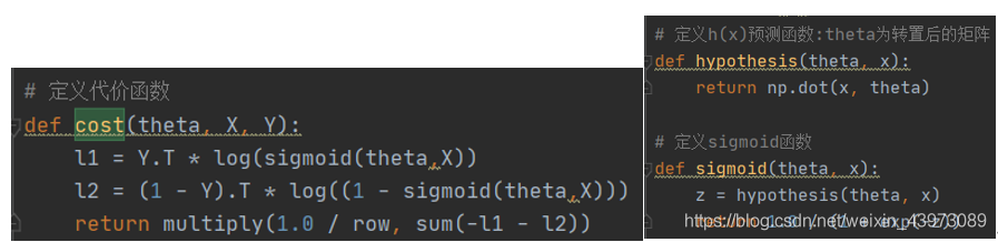 根據(jù)基本原理中的代價(jià)計(jì)算公式,這里將sigmoid、損失公式代碼化: