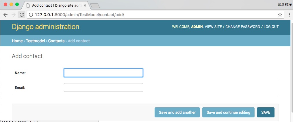 我們可以自定義管理頁(yè)面,來(lái)取代默認(rèn)的頁(yè)面。比如上面的 “add” 頁(yè)面。我們想只顯示 name 和 email 部分。修改 TestModel/admin.py: