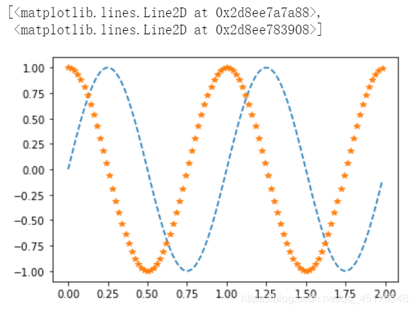 plt.plot(b,np.sin(2*np.pi*b),'--',b,np.cos(2*np.pi*b),"*")