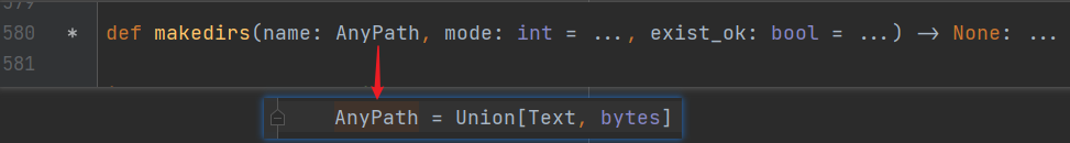 點(diǎn)擊*號(hào)就會(huì)跳到對(duì)應(yīng)的__init__.pyi文件,這個(gè)文件里按照PEP484規(guī)定,為os模塊每個(gè)函數(shù)都定義了對(duì)應(yīng)的類型檢查規(guī)則。