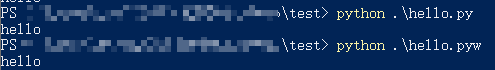 Windows 系統(tǒng),新建兩個(gè)內(nèi)容相同的 Python 文件hello.py和hello.pyw,用python + 文件 的方式運(yùn)行,結(jié)果一樣: