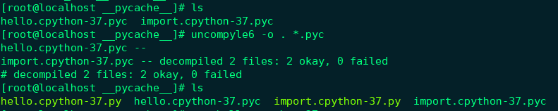 打開(kāi)生成的文件hello.cpython-37.py和import.cpython-37.py,可以看到和之前的py代碼內(nèi)容一模一樣,不過(guò)多了一些 Python 的版本信息。