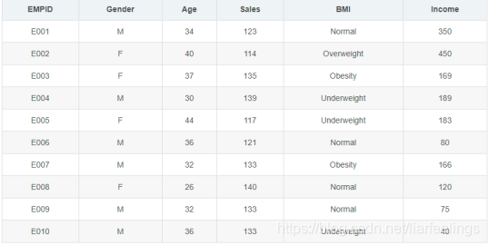 info = [{"name": "E001", "gender": "man", "age": "34", "sales": "123", "income": 350},