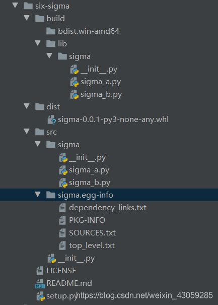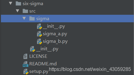 如下圖,比如sigma目錄是我要上傳的項目,在six-sigma目錄下新建三個文件,分別是LICENSE也就是開源協(xié)議,README.md文件,用于介紹自己的項目和setup.py這個配置文件,此文件配置關(guān)于項目和作者的一些信息,接下來我們一一介紹。