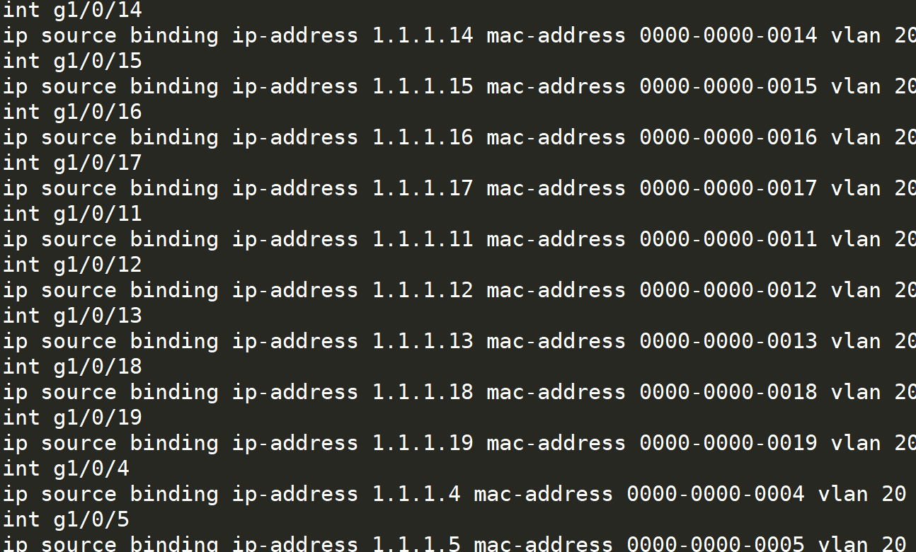 ip source binding ip-address 1.1.1.14 mac-address 0000-0000-0014 vlan 20