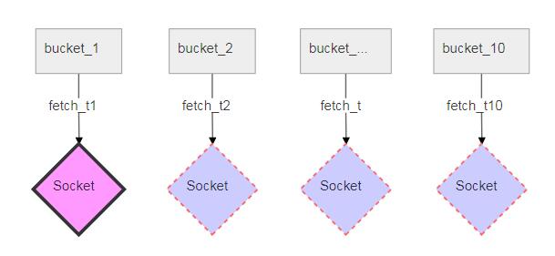 由主線程Main Thread反復(fù)從桶里取數(shù)據(jù)片(t1),每取1片發(fā)送一次,然后再取下一片(t2),直到所有桶都被取了一次(例子中有10片)。