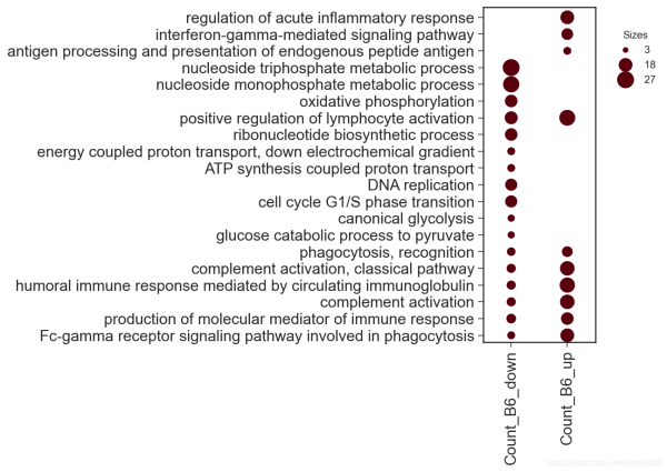 dp = dotplot.DotPlot.parse_from_tidy_data(data, item_key='Description', group_key='group', sizes_key='Count') # 該效果完全同上,這是python語言特性 sct = dp.plot(size_factor=10, cmap='Reds')