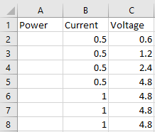 - 字典值的功率、電流和電壓(第二、第三和第四列)