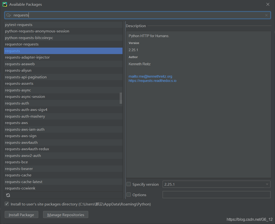 點擊對話框下面的 + 號,在輸入框輸入想要安裝的第三方庫,我們這里安裝requests庫