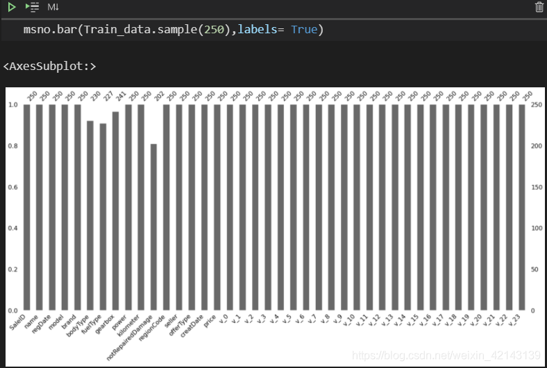 其中,Train_data.sample(250)表示隨機(jī)抽樣250行,白色條紋表示缺失