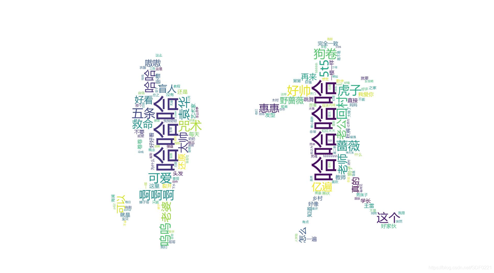 使用wordcloud庫,并使用前面爬取的B站彈幕作為詞云內(nèi)容,二值化圖片作為遮罩
