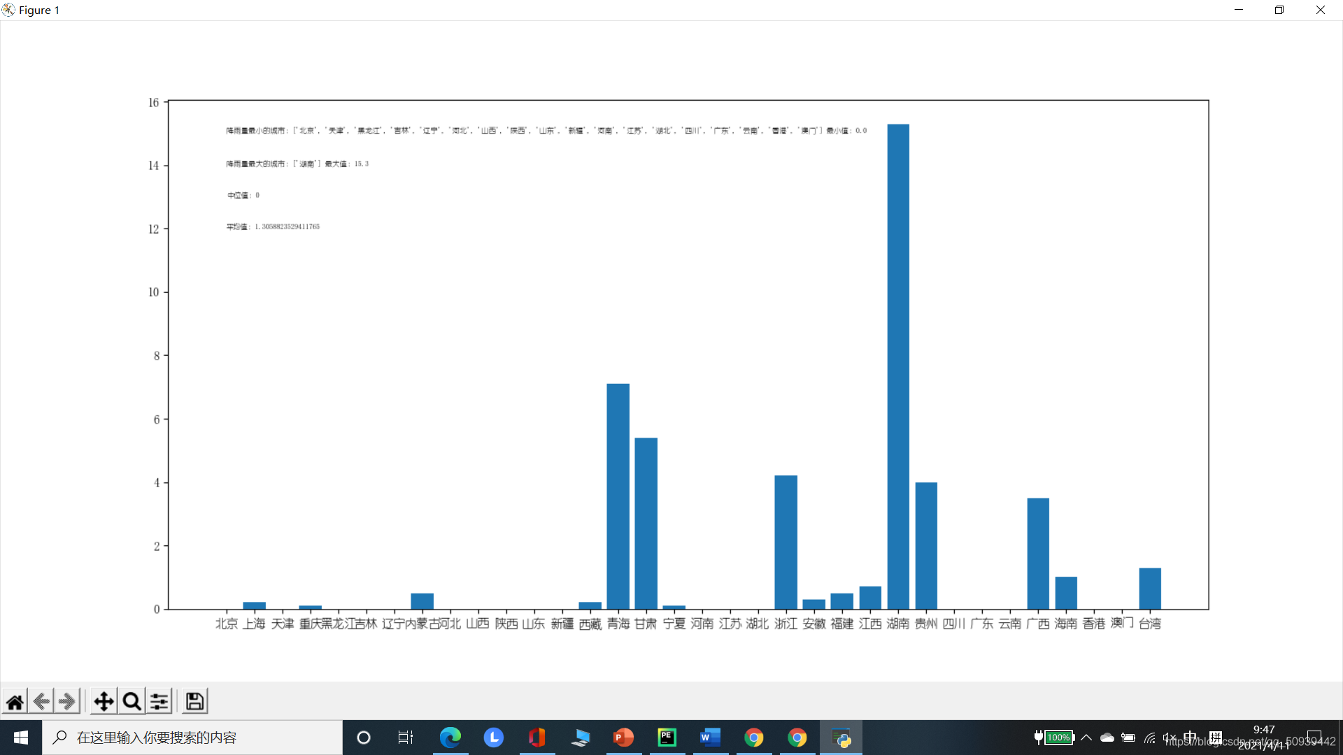 max_text = "降雨量最大的城市:"+str(city_max)+" 最大值:"+str(max_rain)