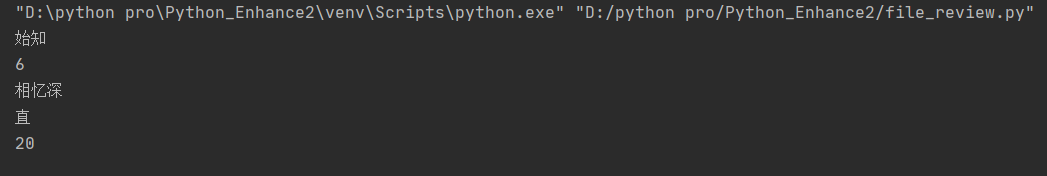 注解:先讀取兩個漢字,print輸出 “始知”,此時光標位置為6說明utf-8編碼格式中每個漢字占3個字節(jié),之后再讀取5個,而只顯示了相憶深并換行打印了直,是因為還有一個換行符,此時光標定位到20,又能說明轉義符在utf-8編碼格式中占2個字節(jié)。