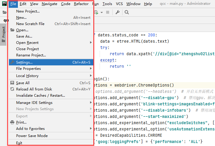 在Pycharm菜單欄中找到并點擊【file】->【settings】