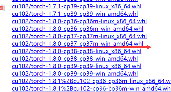 (cu102表示的是cuda10.2,大家根據(jù)自己cuda的版本進行搜索,cp37是python的版本,我的是3.7.4,win就是windows系統(tǒng)了,選擇最新的版本下載即可)