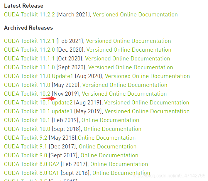 2、官網(wǎng)下載相對應(yīng)的CUDA: (https://developer.nvidia.com/cuda-toolkit-archive)