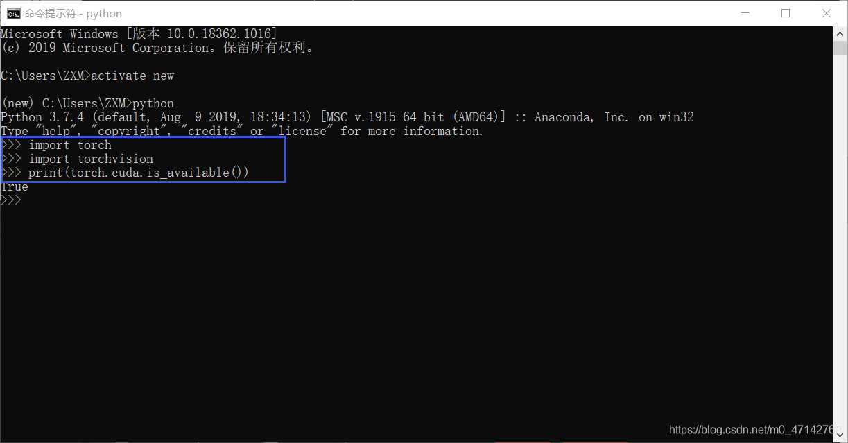 要記得先進入之前創(chuàng)建的環(huán)境中,然后依次輸入藍色方格中的代碼,沒有報錯,且最后輸出True,則說明pytorch環(huán)境安裝完成。