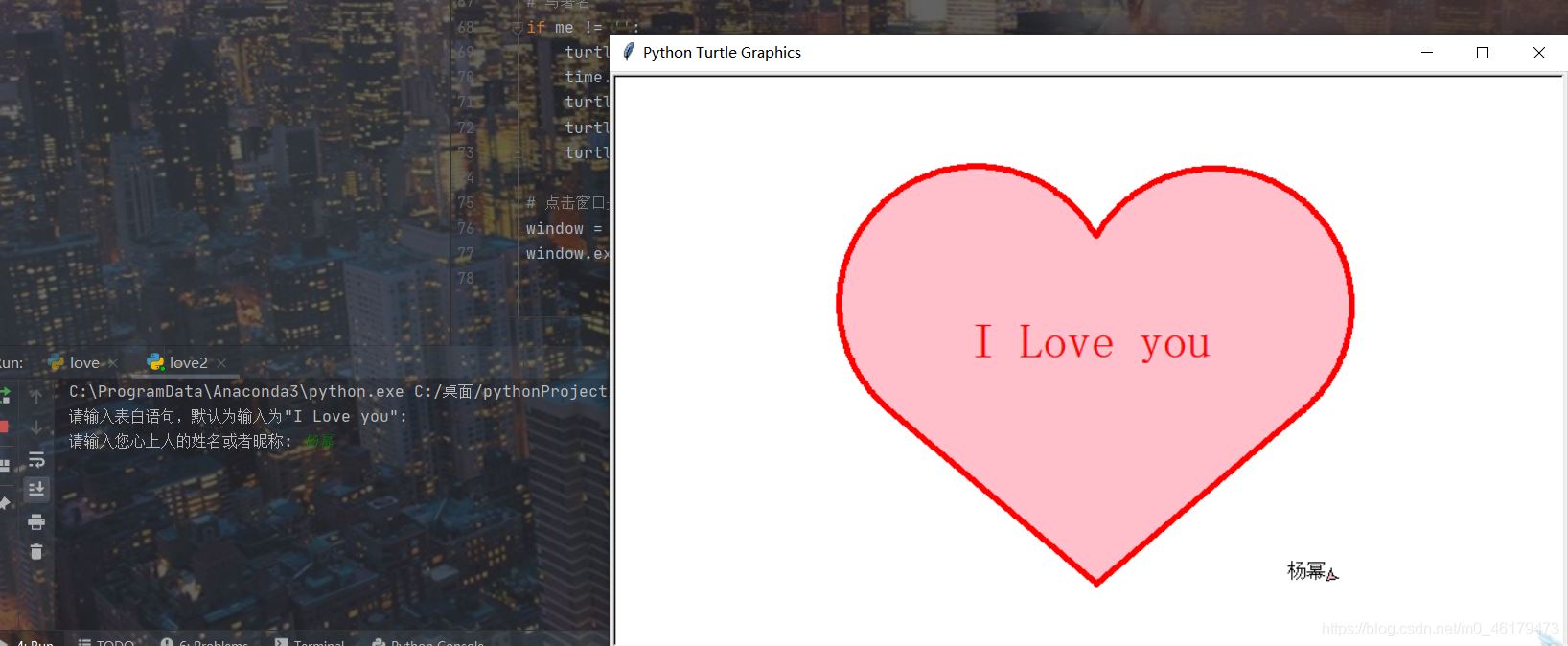 love = input('請(qǐng)輸入表白語句,默認(rèn)為輸入為"I Love you": ')