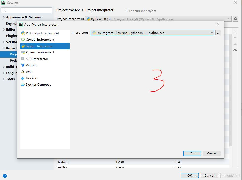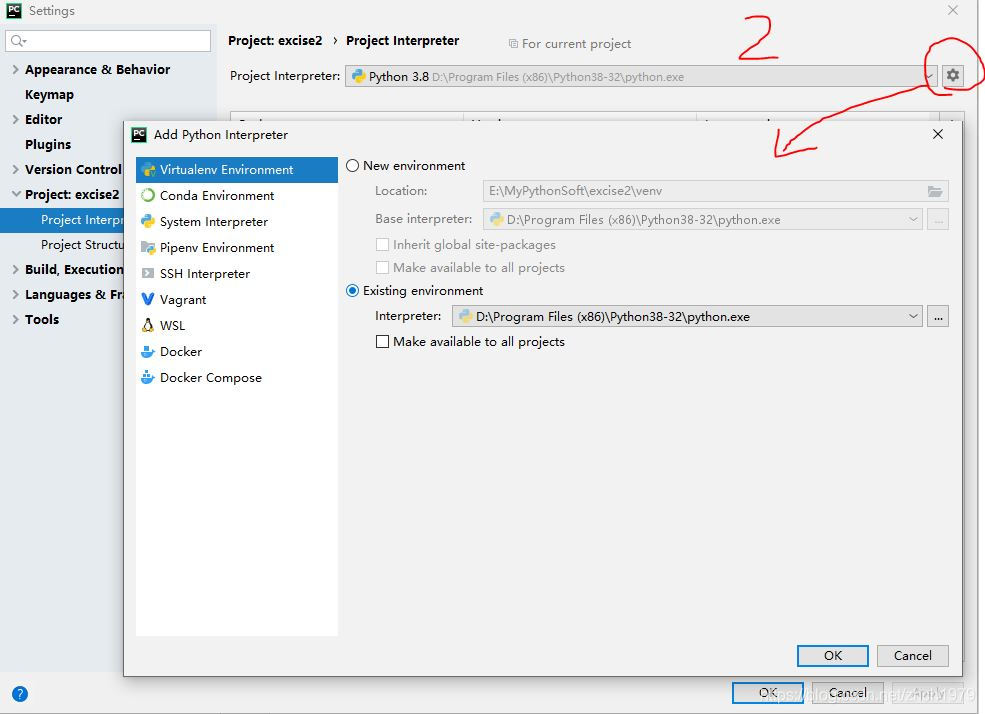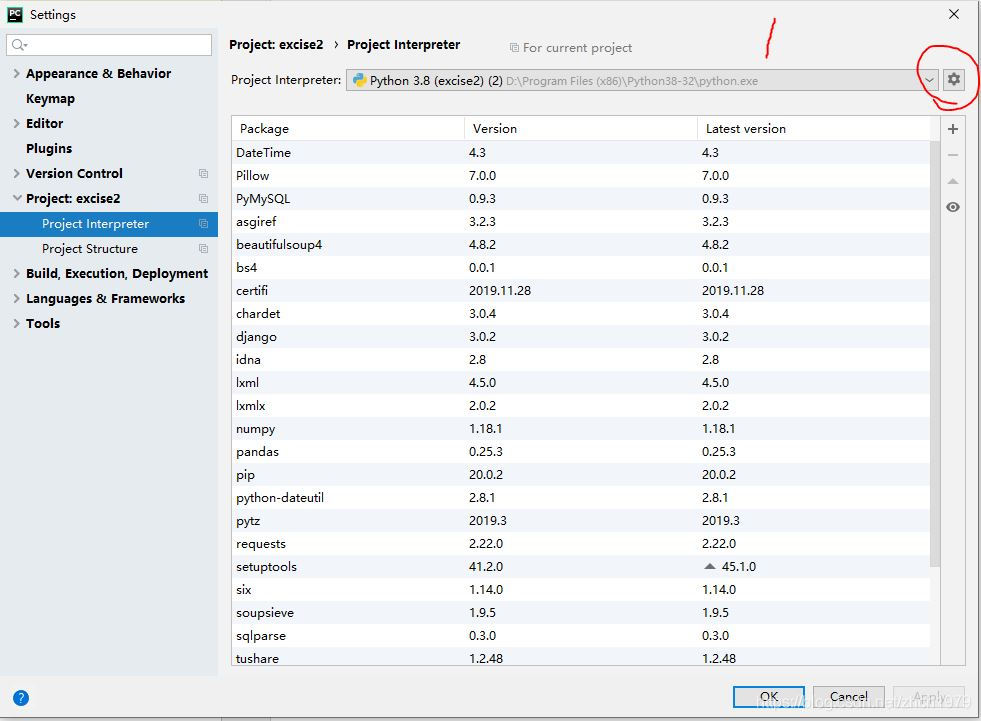1、pycharm界面左上角file--settings,打開如下窗口,選擇project+項(xiàng)目名稱(我的項(xiàng)目名稱是 excise2)下的 project interpreter,右側(cè)點(diǎn)紅圈標(biāo)示處的齒輪,點(diǎn)add...