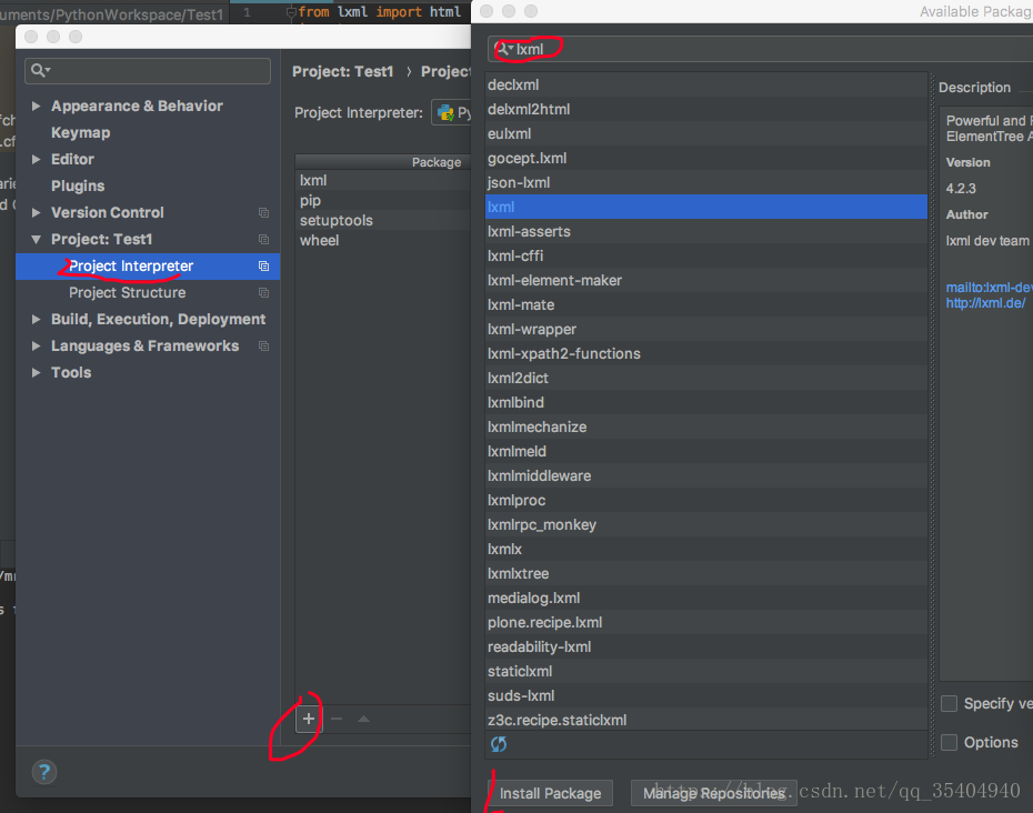 打開PyCharm, 然后PyCharm -> Preferences -> 在搜索框中輸入Project Interpreter, 轉(zhuǎn)到 -> 找到左下角的"+"點(diǎn)擊 ->在搜索框中輸入"lxml", 然后點(diǎn)擊左下角的 "install Package", 等加載完成關(guān)閉即可 -> 返回上頁(yè)"OK"即可