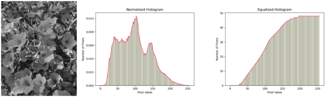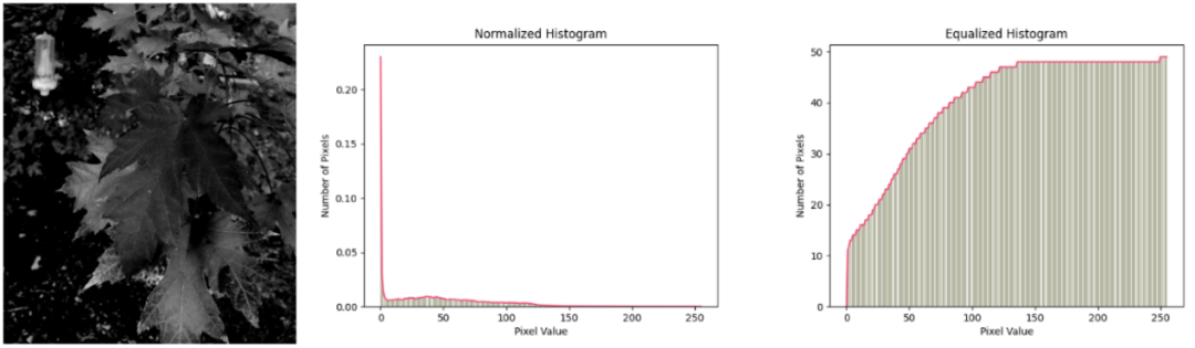 這是我們拍攝的3張不同圖片,并用作示例。如圖4所示,對(duì)于第一個(gè)圖像,直方圖顯示低強(qiáng)度像素的數(shù)量多于明亮像素。對(duì)于第二張圖像,情況完全相反,其中較亮像素的密度遠(yuǎn)大于較暗像素的密度。第三張圖片似乎具有半正態(tài)直方圖。