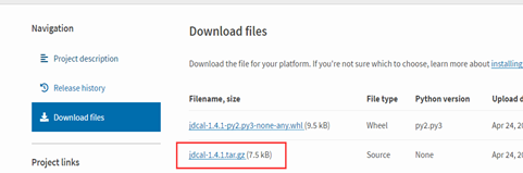 1、官網(wǎng)https://pypi.org/project/jdcal/#files下載jdcal安裝壓縮包;