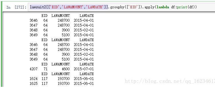 lawsuit2[['EID','LAWAMOUNT','LAWDATE']].groupby(['EID']).apply(lambda df:print(df))