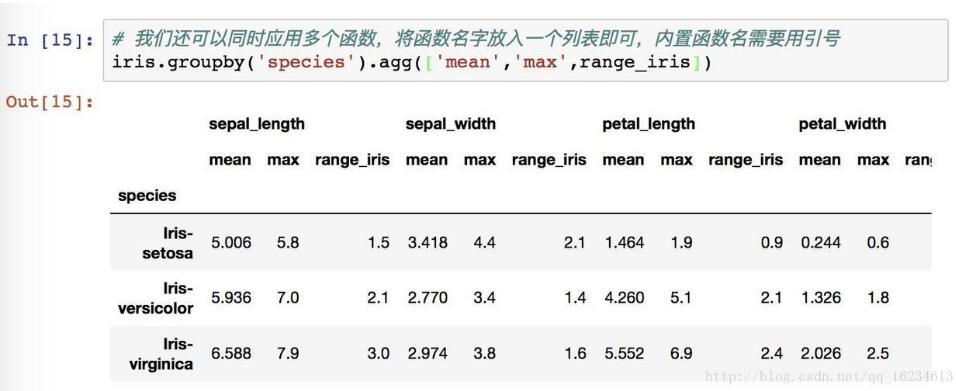 對于agg函數(shù),其不僅可以傳入一個函數(shù)對每列執(zhí)行相同的操作,還可以傳入一個字典{'col_name':func},來對不同的列做不同的操作,也可以將func替換為由多個不同的函數(shù)組成的list,實(shí)現(xiàn)對同一列做多個不同的操作,這是agg函數(shù)最為靈活的地方。