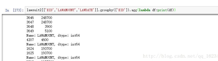 lawsuit2[['EID','LAWAMOUNT','LAWDATE']].groupby(['EID']).agg(lambda df:print(df))