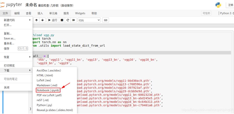 然后點(diǎn)擊“文件”、通過(guò)“下載”將其保存為“ipynb的格式”的文件;