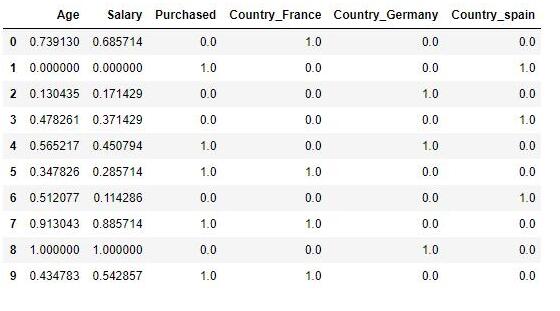 sc_X = pd.DataFrame(data=sc_X, columns=["Age", "Salary","Purchased","Country_France","Country_Germany", "Country_spain"])