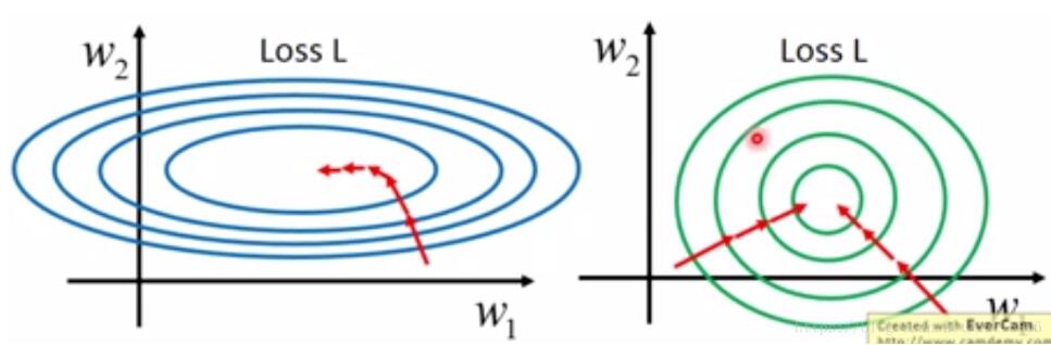 左圖表示未經(jīng)過數(shù)據(jù)標(biāo)準(zhǔn)化處理的loss更新函數(shù),右圖表示經(jīng)過數(shù)據(jù)標(biāo)準(zhǔn)化后的loss更新圖。可見經(jīng)過標(biāo)準(zhǔn)化后的數(shù)據(jù)更容易迭代到最優(yōu)點,而且收斂更快。